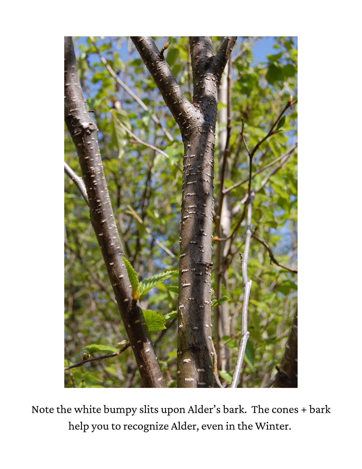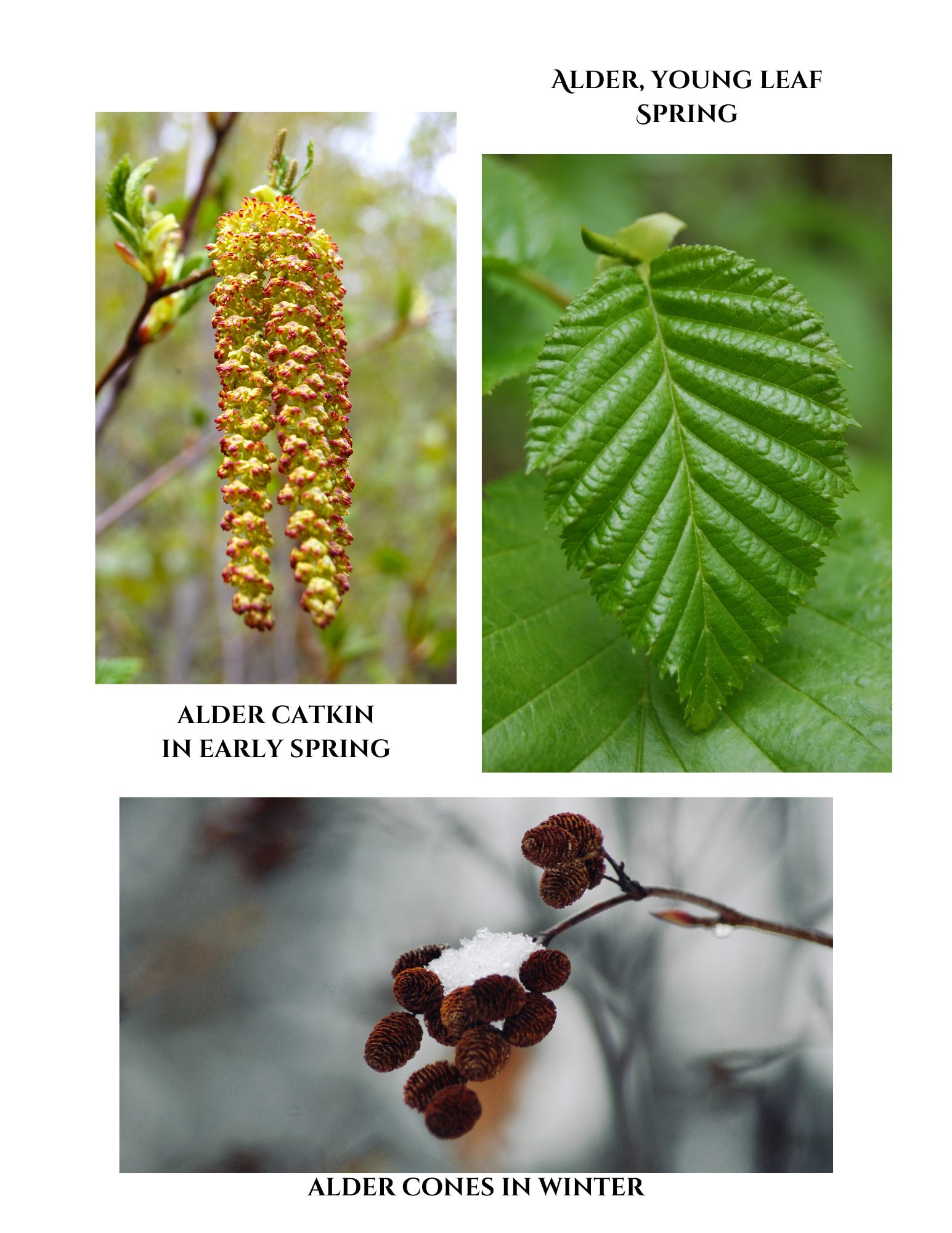 I don’t recall Alders while growing up, it was in Alaska where we became acquainted. Those dense thickets near waterways that could hide nearby bears if you weren’t mindful. In the Spring, the flowers would droop off the ends of branches, glimmering golden-green. In Autumn, the little Alder cones could double for Pine cones in a fairy house. Fast growing, and nitrogen fixing, Alders are considered a pioneer-species. They come in, especially growing where their roots can be damp, and shore up sandy banks, providing shade, and later leaf debris help the Cottonwoods that often follow.
