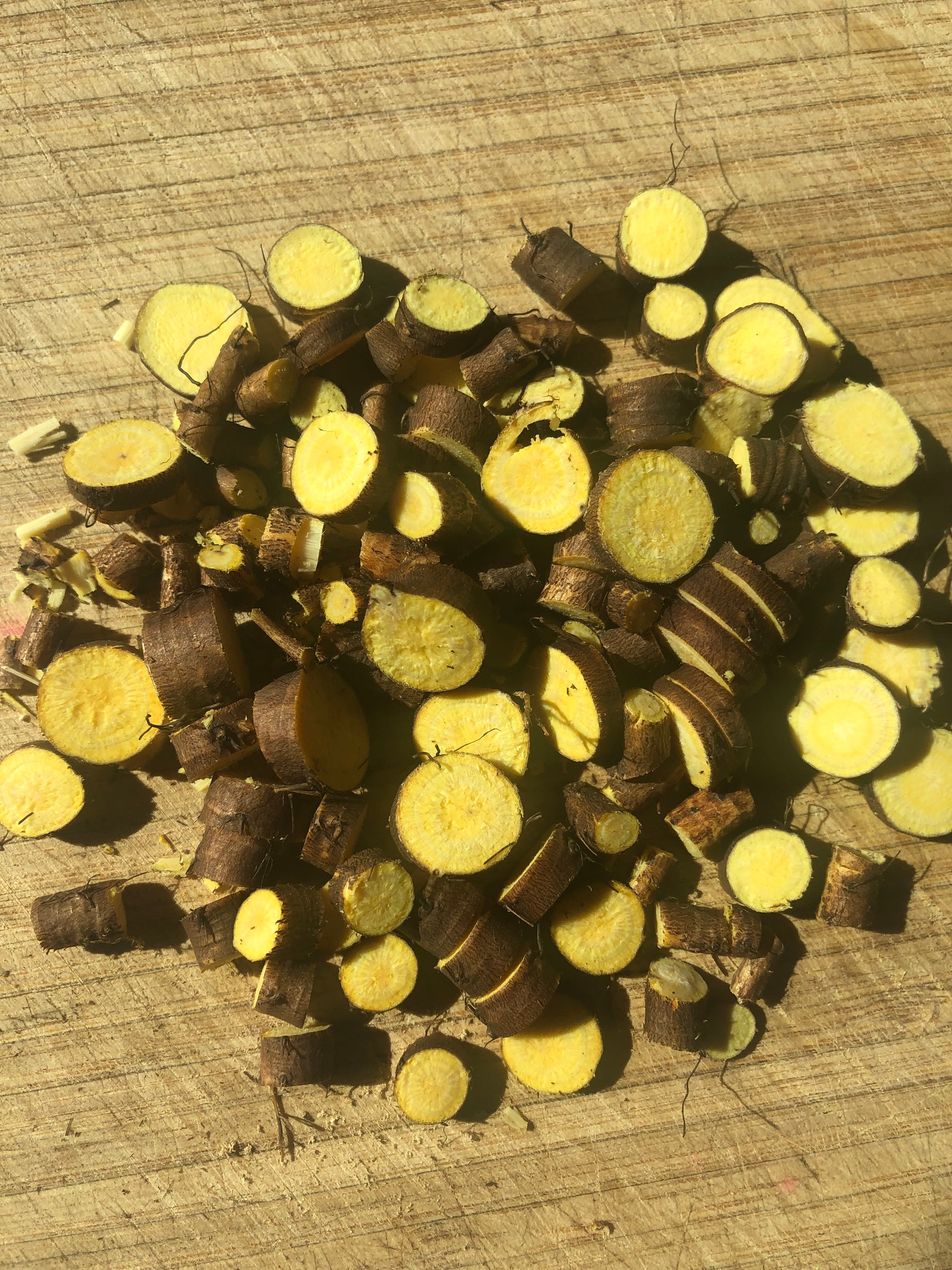 I hosed off and then scrubbed the Yellow Dock and Dandelion roots. Brought them inside and began chopping them up. Decided to add the following fresh ingredients: Ginger and some Orange peel, I had a Blood Orange that did the trick. These really help with flavor and Ginger is a potentizing plant—it has the ability to accentuate the power of the other herbs in a formula.