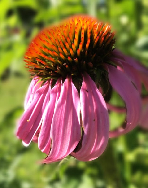 Next up is Echinacea. You’d think that as an herbalist, lover of plant medicine and magic, that Echinacea was always a top ten herb pick for me. Well, it wasn’t—I tried making a tincture from dried, organic roots when I lived in Alaska. When we moved, I dumped the whole thing out—it just felt, flat, not helpful. Now…well, I gotta say, I really like using this plant for medicine! She’s been growing in my garden ever since 2022 when I received the wrong live plant order from Azure Standard.